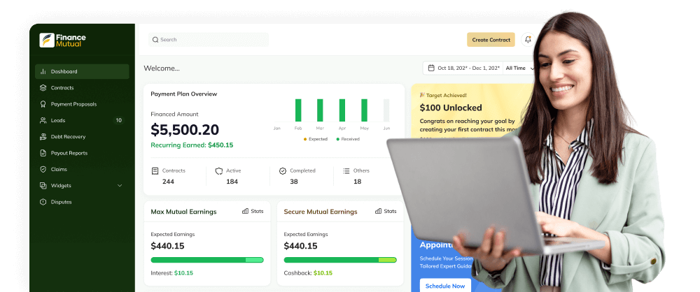 At FinanceMutual™, we’re not just providing payment tools, we’re building a smarter financial ecosystem where your business thrives. From flexible financing options to intelligent debt recovery, every feature in the FM is designed to put control, clarity, and confidence back in your hands. Whether closing more deals with Max Mutual, securing your revenue with Secure Mutual, or streamlining collections through ethical automation, FM equips you to scale with purpose and serve your customers better. We’re not just here to help you offer financing, we’re here to support your bigger goals and long-term success.